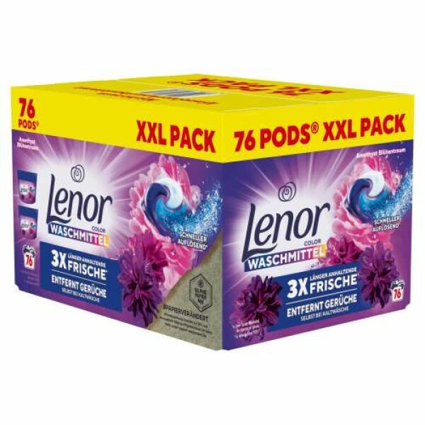 Entdecke die Lenor Amethyst Blütentraum Color Waschmittel PODS® für 3X länger anhaltende Frische und extra Geruchsabwehr, selbst bei Kaltwäsche (im Vergleich zu Lenor Sensitiv Waschmittel bei Lagerung im Schrank). Die Lenor PODS® lösen sich schneller auf als zuvor und bieten eine innovative Tiefenreinheitsformel für deine Wäsche. Die Lenor PODS® haben ein einmaliges, mehrkammeriges Design mit einer Ultra-Reinigungskraft, sodass auch unsichtbarer Schmutz, der sich tief in die Kleidung setzt und für unangenehme Gerüche sorgt, entfernt wird! Ich fühl mich wohl in Lenor!