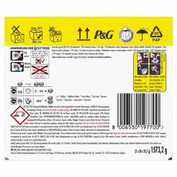 ANWENDUNG: Platziere die Lenor PODS® Waschkapsel hinten in die leere Trommel, lege die Wäsche AUF die PODS®. Verwende 2 Lenor PODS® für eine Wäscheladung über 6 kg sowie für stark verschmutzte Kleidung