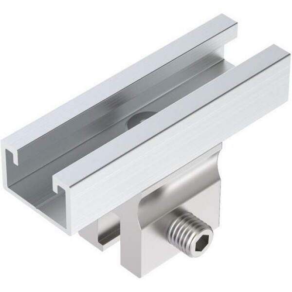 für Doppelfalz-Dacheindeckungvormontiert mit KurzschieneMontagekanal für Hammerkopf 28/15 M8 oder Klick-SockelKlemme: Länge: 30 mm, Material: Aluminium / rostfreier StahlSchiene: Länge: 80 mm, Material: Aluminium EN AW-6063 T66