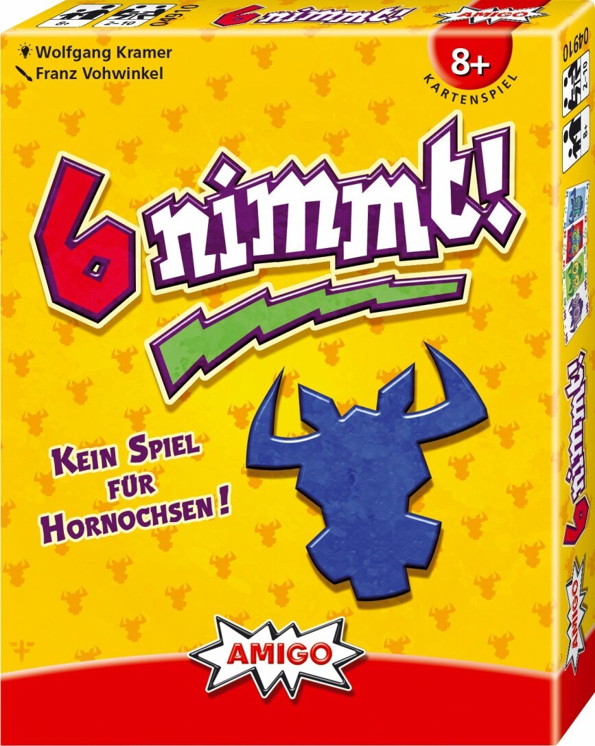 6 nimmt! MBE3 Kein Spiel für Hornochsen! Alle Mitspielenden bekommen zehn Handkarten, die sie möglichst geschickt an eine von vier Kartenreihen anlegen. Doch bei 6 nimmt! ist der Name Programm: Wer die sechste Karte legt, muss die ersten fünf Karten nehmen und das bringt Minuspunkte. 6 nimmt! von Erfolgsautor Wolfgang Kramer ist ein raffiniertes Kartenspiel, das einen nicht mehr loslässt. So spielt man 6 nimmt! MBE3: * Bereitet vier Kartenreihen auf dem Tisch vor. * Jede Runde legt ihr jeweils eine eurer Handkarten verdeckt vor euch ab und deckt diese dann gleichzeitig auf. * Legt die niedrigste Karte zuerst an eine der Reihen an, dann die zweitniedrigste usw. * Jede Reihe darf maximal aus fünf Karten bestehen. * Sobald du die sechste Karte in eine Reihe legst, musst du die ersten fünf Karten nehmen. Hierfür gibt es Minuspunkte. * Ein Durchgang endet, wenn ihr keine Karten mehr auf der Hand habt. Dann werden die Minuspunkte für alle notiert. * Hat nach einem Durchgang eine Person 66 oder mehr Minuspunkte, endet das Spiel. Wer von euch die wenigsten Minuspunkten hat, gewinnt. Inhalt: * 104 Spielkarten * 1 Spielanleitung Maße: 12,3 x 9,7 x 2,2 cm Autor: Wolfgang Kramer Grafik: Franz Vohwinkel Erfolgsfaktoren: * Ausgezeichneter Topseller von Wolfgang Kramer * Mehrere Millionen verkaufte Spiele, in über 30 Ländern vertreten * Für große Spielrunden geeignet * Schnell erklärt einfach gespielt * 1. Platz ''Deutscher Spiele Preis'' (1994) * Auswahlliste ''Spiel des Jahres'' (1994) * Bestes Kartenspiel (''Fairplay'') * spiel gut