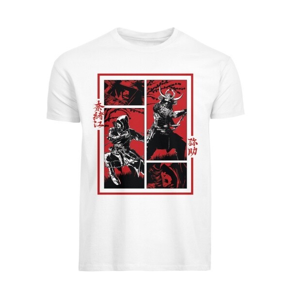 - Das weiße T-Shirt in Größe XXL zeigt das Keyart zeigt Naoe und Yasuke, die Hauptfiguren in Panels im Manga-Stil