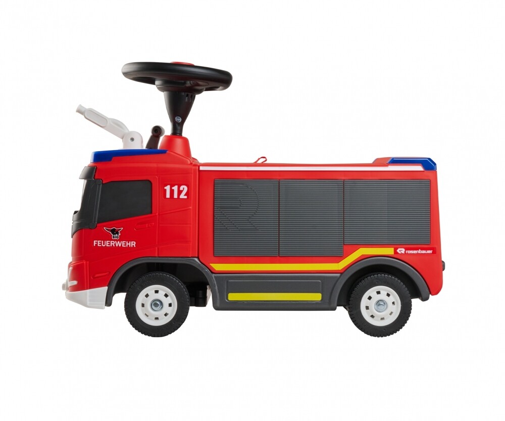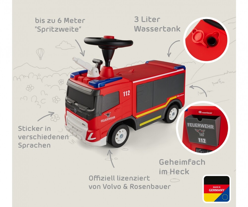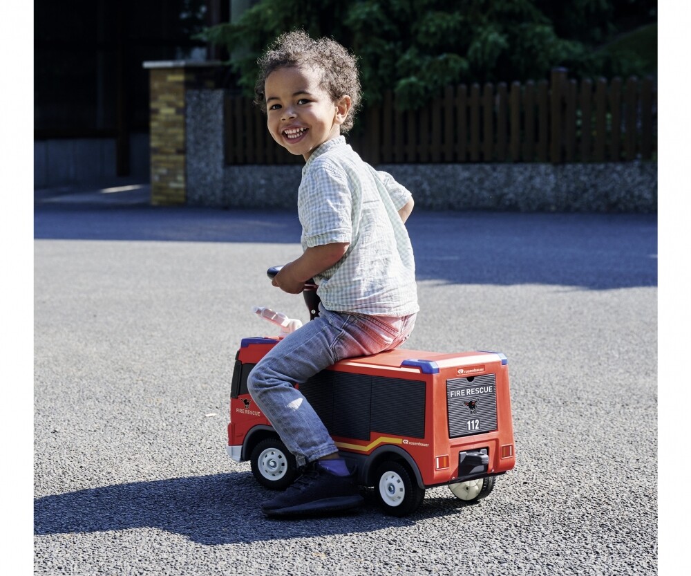 Mal sitzend, mal schiebend, mal laufend bewegen sich die kleinen Feuerwehrleute in ihrem Rutschauto von A nach B, denn das Fahrzeug ist auf die unterschiedlichen motorischen Fähigkeiten der Kleinen von 2 bis 5 Jahren abgestimmt. Das griffige Lenkrad mit Hupe und die kleine Rückenlehne erleichtern das Sitzen, während das Geheimfach neue Spielmöglichkeiten eröffnet. Das Highlight ist jedoch die Wasserkanone, die per Hebel aktiviert wird und das Wasser bis zu 6 Meter weit spritzen lässt. Natürlich nur, wenn der Wassertank gefüllt ist!