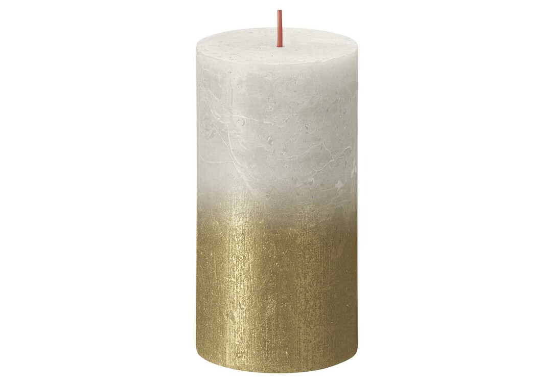 aus 25 % pflanzlichem Wachs aus Europa, frei von Palmöl und tierischen Fetten, einem Docht aus fair gehandelter Baumwolle, sandgrau / gold, durchgefärbt, Brenndauer ca. 60 Stunden (die Brenndauer ist nur bei bestmöglichen Verhältnissen gewährleistet)