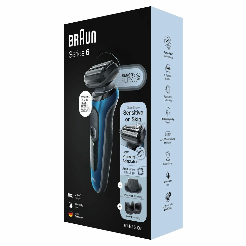 Braun Series 6 61-B1500s. Rasierapparatsystem: Folienschaber, Produktfarbe: Blau, Steuerung: Tasten. Energiequelle: Akku, Akku-/Batterietechnologie: Lithium-Ion (Li-Ion), Akku-/Batterietyp: Integrierte Batterie. Menge pro Packung: 1 Stück(e), Zusatzkämme: Bart