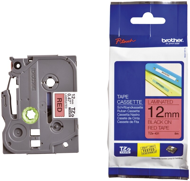 Brother TZE-431. Aufkleberfarbe: Schwarz auf rot, Bandtyp: TZe, Ursprungsland: Philippinen. Speicherbandbreite (metrisch): 1,2 cm, Bandlänge: 8 m, Breite: 17 mm. Palettenhöhe (brutto): 16,2 cm, Anzahl Kartons pro Palette: 36 Stück(e), Lagenanzahl pro Palette: 6 Stück(e). Band-Größe: 1,2 cm