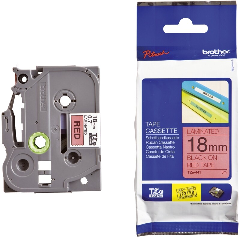 Brother TZE-441. Aufkleberfarbe: Schwarz auf rot, Bandtyp: TZe, Produktfarbe: Grau. Speicherbandbreite (metrisch): 1,8 cm, Bandlänge: 8 m, Breite: 23 mm. Band-Größe: 1,8 cm