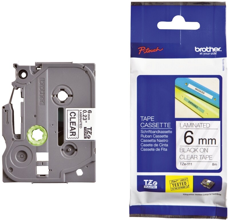 Brother TZE-111. Aufkleberfarbe: Schwarz auf transparent, Bandtyp: TZe, Produktfarbe: Transparent. Speicherbandbreite (metrisch): 6 mm, Bandlänge: 8 m, Breite: 19 mm. Palettenhöhe (brutto): 16,2 cm, Anzahl Kartons pro Palette: 36 Stück(e), Lagenanzahl pro Palette: 6 Stück(e). Band-Größe: 6 mm
