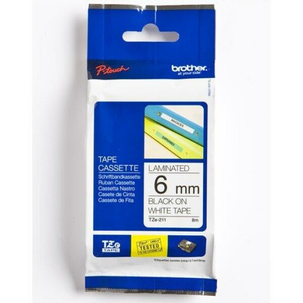 Brother TZe-211. Aufkleberfarbe: Schwarz auf weiss, Bandtyp: TZe, Produktfarbe: Grau. Speicherbandbreite (metrisch): 6 mm, Bandlänge: 8 m, Menge pro Packung: 1 Stück(e)