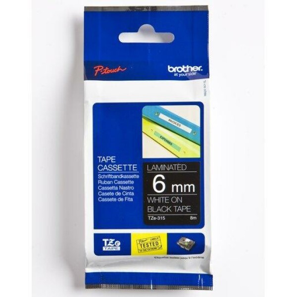 Brother TZE315. Aufkleberfarbe: Weiss auf Schwarz, Bandtyp: TZe, Produktfarbe: Grau. Speicherbandbreite (metrisch): 6 mm, Bandlänge: 8 m, Breite: 18 mm. Band-Größe: 6 mm