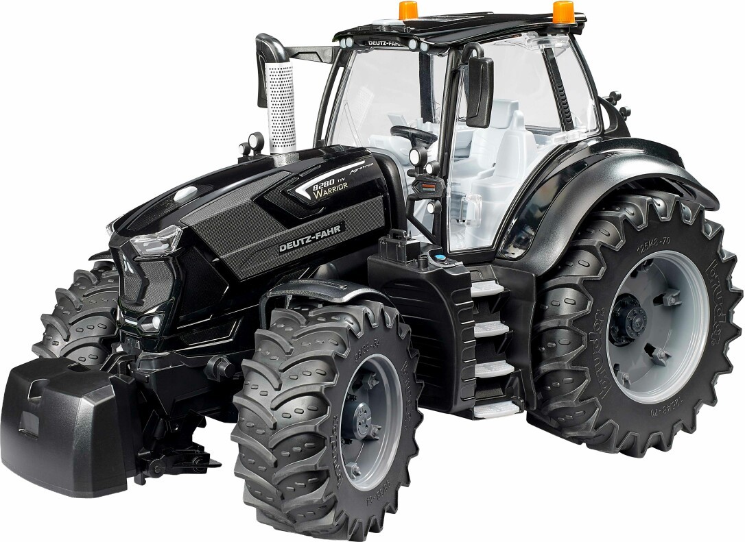 Der 8280 TTV von DEUTZ-FAHR: Wo Kraft auf Präzision trifft. Der 8280 TTV ist eine zuverlässige und starke Arbeitsmaschine mit dem perfekten Technologiemix für professionelle Landwirte. Mit beeindruckenden 287 PS ist dieser Traktor allen Herausforderungen gewachsen. Besonders beeindruckend in Sachen Design ist die exklusive, schwarze Variante dieses Traktors, der Warrior. Auch in punkto Funktionalität und Qualität steht das neue Modell von BRUDER im Maßstab 1:16 dem Vorbild in nichts nach, getreu dem Motto - Just like the real thing. Die Fahrerkabine ist voll verglast und die Türen sind einfach zu öffnen. Die aufklappbare Motorhaube gewährt Einblick auf den Motor. Die einfache Lenkbarkeit wird durch die eingebaute Pendelachse und die, durch das Schiebedach einsetzbare Lenkverlängerung erreicht. Zur Erweiterung dieses Modells kann ein Frontlader (Art.-Nr. 03333) montiert werden. Für noch mehr Spielspaß sind die abnehmbaren Räder angebracht. Die Erweiterung durch das Figurenset Werkstatt (Art.-Nr. 62100) erhöht nochmals den Spielwert dieses Traktors. Selbstverständlich passen an dieses schwarze Schmuckstück alle landwirtschaftlichen Anhänger und landwirtschaftlichen Arbeitsgeräte aus dem Hause BRUDER.
