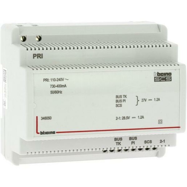 NETZGERÄT: 2-Draht-Netzgerät mit integriertem Videoadapter für den Verteilereinbau (Profilschiene 35mm). ANWENDUNG: Gleichermaßen verwendbar für Audio- und Videoanlagen von der Marke Bticino. ANSCHLÜSSE: Enthält 3 BUS-Anschlüsse für Eingang Videotürstation, Eingang Audiotürstation und Steigleitung zu den Hausstationen sowie 1 Anschluss (1 – 2) für Zusatzspannungsversorgung. AUSSTATTUNG: Netzgerät verfügt über eine eingebaute PTC-Absicherung. TECHNISCHE DETAILS: 230 VAC, 50 Hz, Klemmen BUS TK, BUS PI, SCS, 1-2, Ausgang für BUS-Leitung 27 V DC 1,2 A