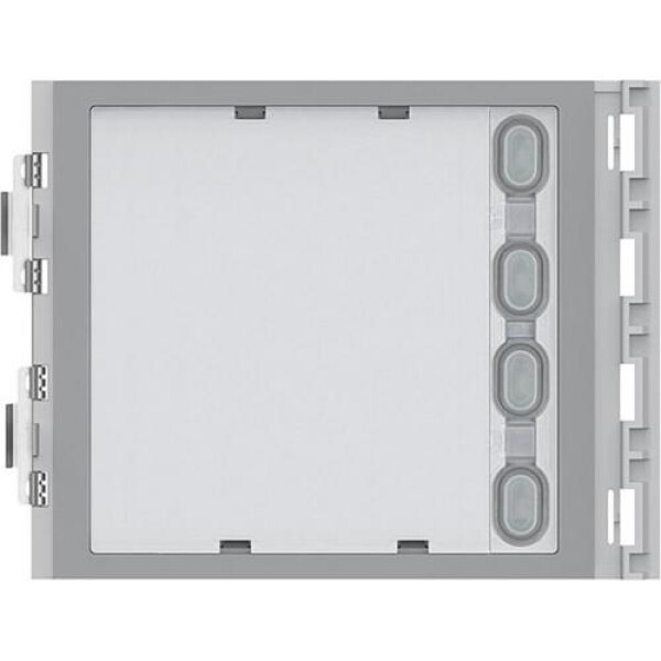 Ruftastenmodul mit 4 Ruftasten (1-reihig) für Sfera New Sprechanlagen. Zur Verwendung mit dem Audio-Türlautsprecher-Modul Art. 351100 bzw. mit den Video-Lautsprechermodulen Art. 351200 und 351300. Anschluss weiterer Ruftasten- oder Infomodule über das mitgelieferte Verbindungskabel. Installationstechnik: 2-Draht Bus-Technik Betriebstemperatur: 25 bis +70 °C, Schutzklasse (Modul mit Frontblende montiert): IP 54