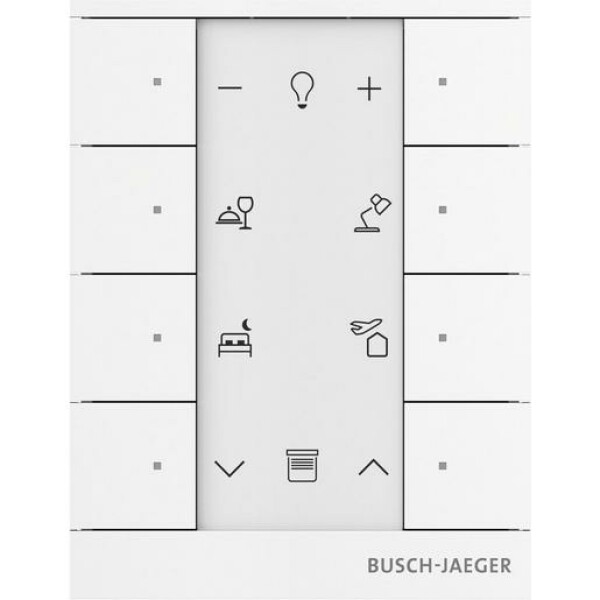 Der Busch-Tenton Raumtemperaturregler mit 8-facher Bedienfunktion ist ein vielseitiges Multifunktionsbedienelement mit integriertem free\@home Busanschluss und praktischem Beschriftungsfeld. Die Tasterfunktionen umfassen Schalten, Dimmen, Jalousie, Wert senden sowie Lichtszenensteuerung. Bedient wird das Gerät über Tastkontakte links und rechts, unterstützt von LEDs zur Anzeige des Schaltzustands oder als Orientierungslicht. Ausgestattet mit integriertem Raumtemperaturregler und Temperaturfühler, kann der Regler im Haupt- oder Nebenstellenbetrieb eingesetzt werden. Die Steuerung erfolgt ausschließlich per App oder Nebenstelle. Die Spannungsversorgung erfolgt über die Bus-Klemmen (a,b).