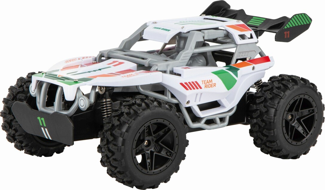 Spaß für Draußen mit dem Team Rider Ab nach draußen mit dem Carrera RC Team Rider! Der coole 23cm lange Flitzer ist der perfekte Begleiter in den Garten oder in den Park, denn ihn hält nichts auf. Seine großen Reifen sind perfekt, wenn kleine Abenteurer ab 6 Jahren ihre Umgebung erkunden und mit bis zu 12 km/h Spitzengeschwindigkeit hat er auch genug Power unter Haube, um ordentlich Tempo zu machen. Durch die Full Function Technologie ist er auch für Einsteiger einfach zu lenken. Das bunte Design mit dem großen Heckspoiler macht den Team Rider zum Hingucker, wenn er über die Straße und durch das Kinderzimmer flitzt. Alle benötigten Batterien sind bereits im Lieferumfang enthalten. RC BUGGY * Volle Fahr- und Lenkfunktion * Vollgefedertes Fahrzeug * Luftreifen