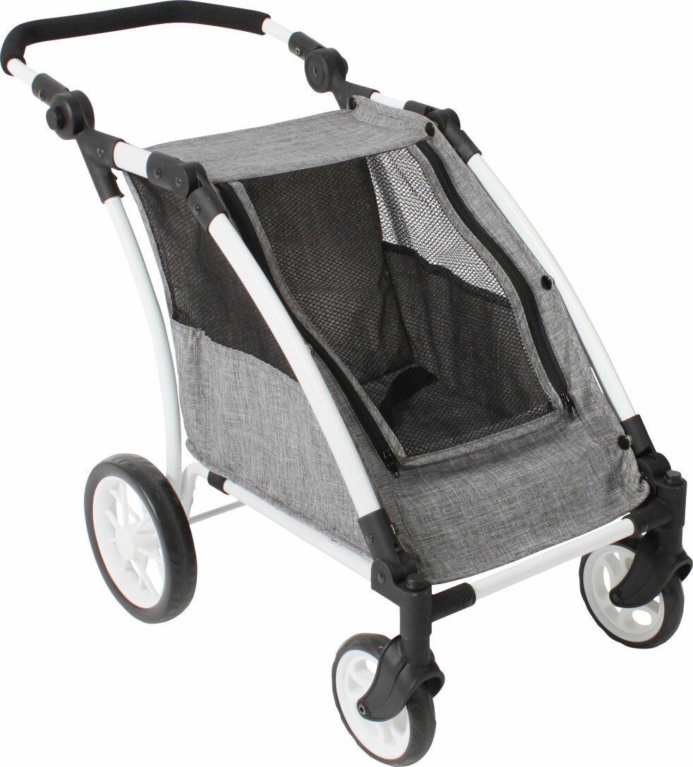 Der brandneue Trailer Roadster hat einen höhenverstellbaren Schiebegriff von 33-72 cm und passt sich somit der Größe Ihres Kindes an. Durch das stabile Gestell und die schwenkbaren Vorderräder ist der Roadster der optimale Begleiter bei Spaziergängen auch auf unebenem Untergrund. Der Trailer hat an beiden Seiten Sichtfenster und das Verdeck besteht aus einem praktischen Moskitonetz, dass mittels Reißverschlüssen geöffnet werden kann. Der Roadster bietet genug Platz für zwei Puppen bis ca. 48 cm Größe. Natürlich ist er auch zum Transport von Kuscheltieren und anderen Spielzeugen bestens geeignet. Mit dem Sicherheitgurt können die Puppen auch angeschnallt werden, so dass sie sicher unterwegs sind. Artikelmaße: 74 x 40,5 x 63 cm, Artikelgewicht: 2,6 kg