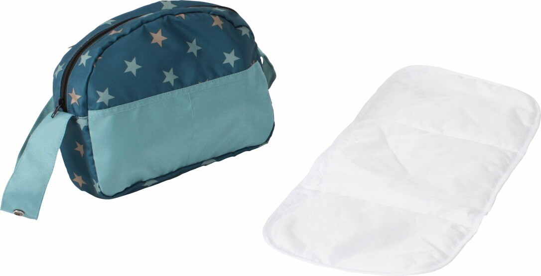 Niedliche Wickeltasche f#r Puppen komplett mit gro#er, abwaschbarer Wickelunterlage. Die Tasche kann mit Druckkn#pfen an der Schiebestange des Puppenwagens befestigt werden. Hochwertiges Puppen-Zubeh#r f#r Ihre Puppe. Mit praktischer Umh#ngefunktion. Artikelma#e: ca. 27 x 9 x 22 cm, Gewicht: 0,2 kg