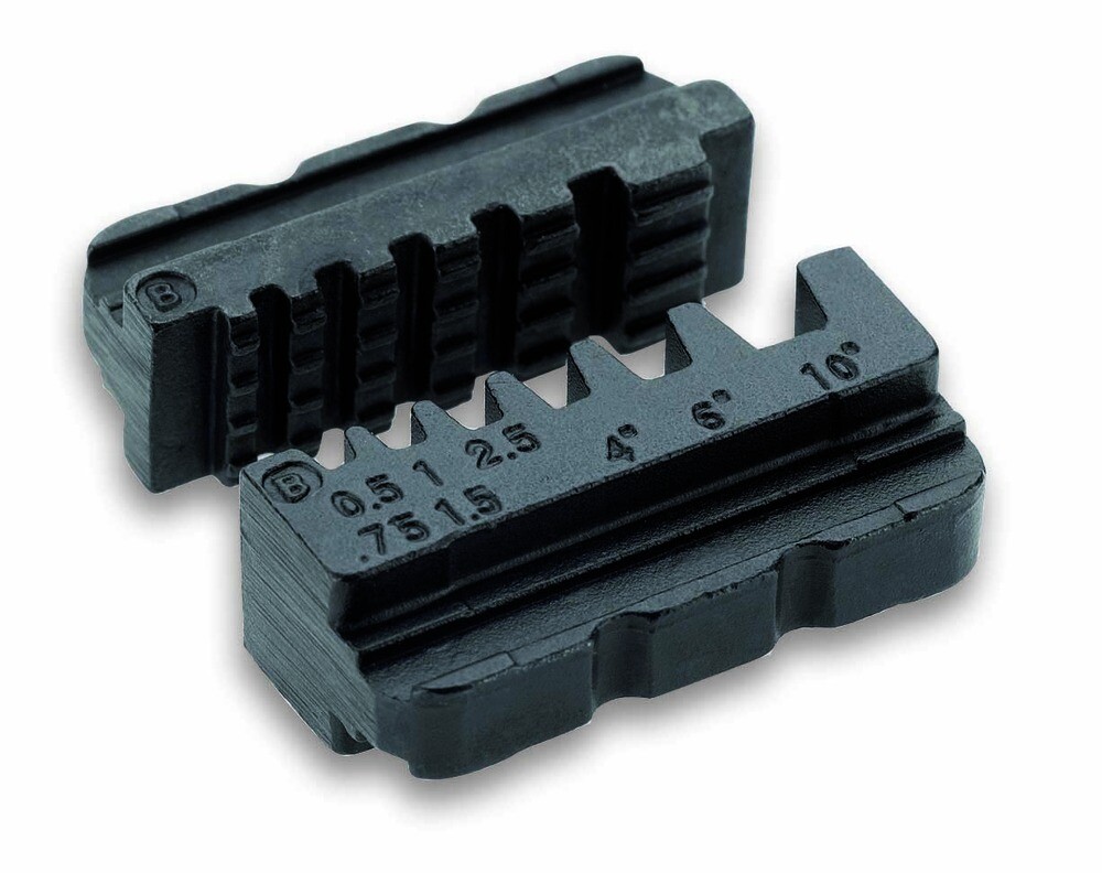 Presszangensystem Click´n´Crimp, neuartiges, patentiertes Presswerkzeugsystem für alle gängigen Kabelverbinder Presszange mit 3 auswechselbaren Pressprofileinsätzen, die durch eine Rasthalterung im Zangenkörper fixiert werden, dadurch sekundenschneller Profilwechsel ohne Zuhilfenahme weiteren Werkzeugs. Die beiden aktuell nicht im Einsatz stehenden Pressprofileinsätze werden in den beiden in die Zangenschenkel integrierten Magazinhaltern unverlierbar aufbewahrt. Mit CLICK´N´CRIMP werden gegenüber anderen Systempresszangen bzw. Einzelwerkzeugen Zeit, Platz, Gewicht und Kosten gespart. Zangenkörper aus 3 mm starkem, spezial vergütetem, gehärtetem Stahlblech, mit Hebelübersetzung für geringen Handkraftaufwand, nachstellbare Ratschenmechanik mit Zwangsentriegelung für normgerechten Pressdruck, ergonomische 2-Komponenten-Griffhüllen, komplett bestückt mit gehärteten präzisen Pressprofileinsätzen jeweils für isolierte Kabelschuhe rot / blau / gelb (0,5 mm² bis 6 mm²), isolierte und nicht isolierte Aderendhülsen 0,5 - 10 mm², nicht isolierte Kabelschuhe 0,5 - 10 mm², Gewicht inkl. 3 Pressprofileinsätze nur 690 g. Ersatzprofil für Aderendhülsen 0,5 - 10 mm² (Trapezpressung)