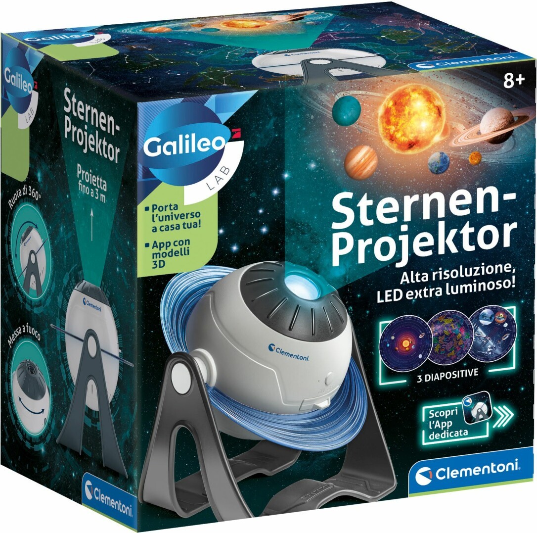 Ein Planetarium zur Beobachtung der Planeten, Sterne und Konstellationen, die direkt an die Wand projiziert werden! Das Produkt enthält verschiedene Bilder, die projiziert werden können. Mit der App kann man auf Quizfragen zugreifen, die Geschichte des Universums hören und die Sternbilder und Planeten in Augmented Reality ansehen. Entwickelt, um auf innovative und unterhaltsame Weise etwas über Astronomie zu lernen! In Italien entwickelt und gestaltet.