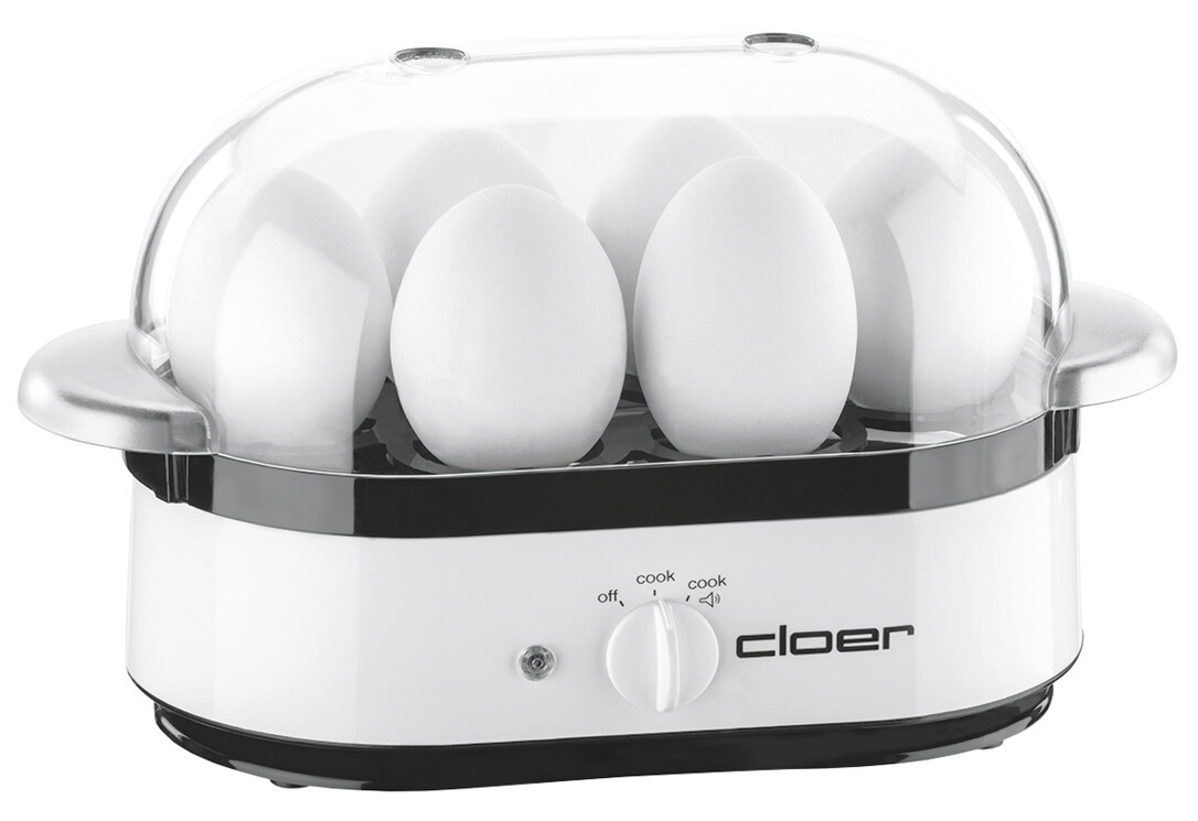 für 6 Eier,Kunstoffgehäuse mit Edelstahl Heizplatte, herausnehmbarer Eierträger, An- / Ausschalter, akustische Fertigmeldung (optional), Kontrolllampe, Kabelaufwicklung, Messbecher mit Eipick, H x B x L: 13,5 x 11 x 23 cm, 350 Watt, Schukostecker CEE 7 / 7