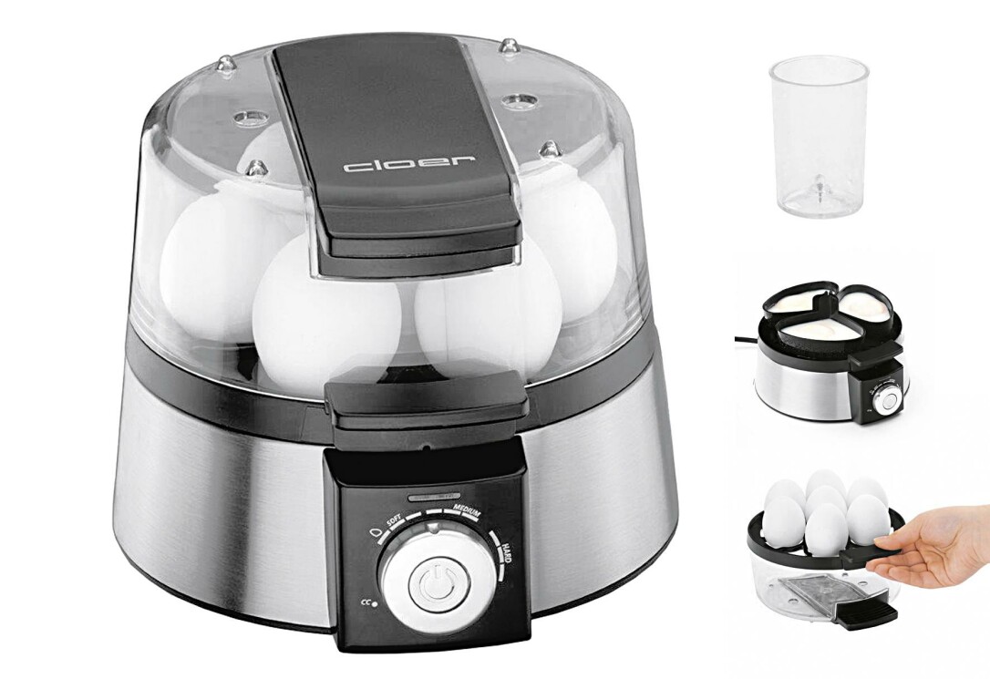 für bis zu 7 Eier, Drehregler zum Einstellen des Härtegrades, Weiterkochfunktion, Start / Stoppknopf, herausnehmbarer Eierträger, Edelstahl Kochbehälter, Kabelaufwicklung, Messbecher mit Eierpiekser, 3 Pochierschalen, Abnehmbarer Deckel mit Servierfunktion, Edelstahlgehäuse, 364 - 435 Watt, 220 - 240 Volt