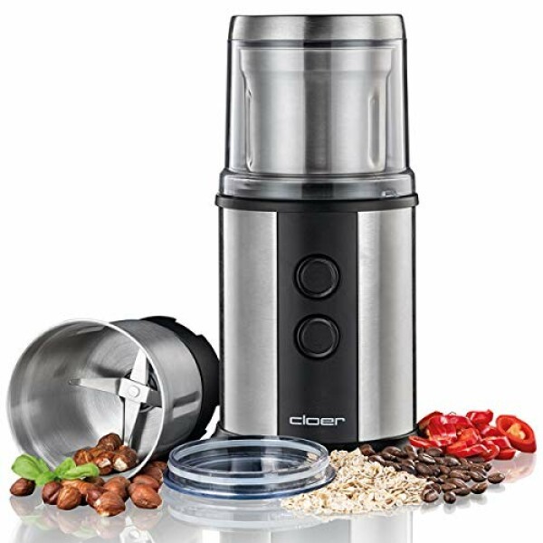 2 Edelstahlbehälter mit Schlagmessern . 2-flügeliges Messer: geeignet zum Mahlen von trockenen Lebensmitteln . 4-flügeliges Messer: geeignet für ölhaltige/ feuchte Lebensmittel . Separater Deckel zum Verschließen des Edelstahlbehälters . Kapazität für bis zu 80g Kaffeebohnen, Gewürze, Kräuter . 2 Geschwindigkeitsstufen . Sicherheitsverriegelung: Betrieb nur mit geschlossenem großen Deckel möglich . Transparenter Deckel für schnellen Blick auf das Mahlgut . Rutschfeste Gummifüße . Abnehmbarer Edelstahlbehälter . Edelstahlgehäuse mit schwarzen Kunststoffelementen