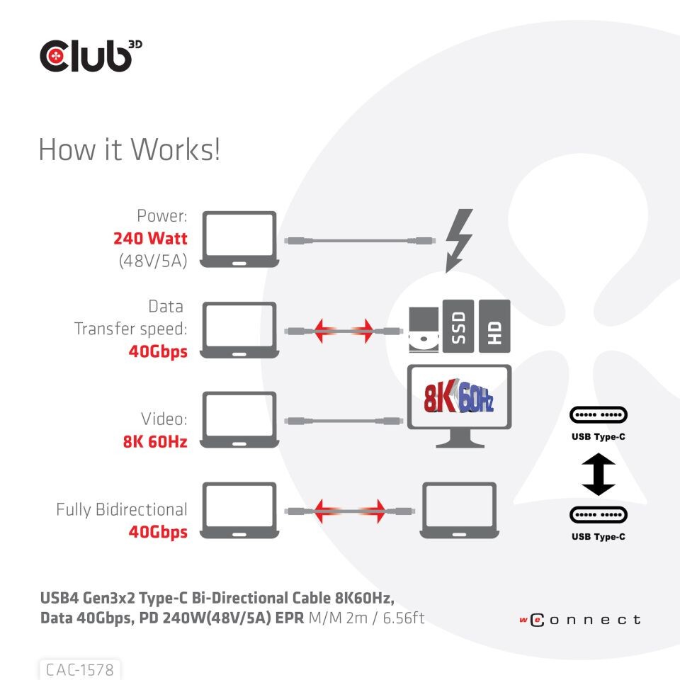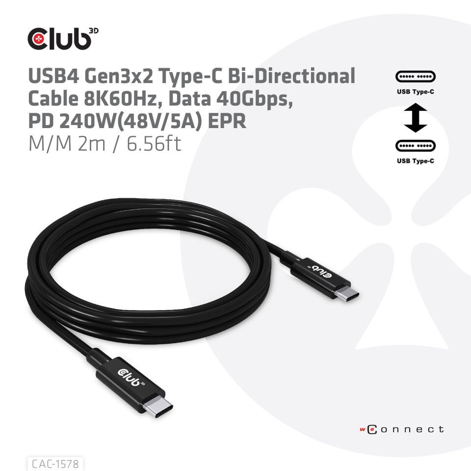 CLUB3D USB4 Gen3x2 Type-C Bi-Direktional Kabel 8K60Hz 40Gbps PD 240W(48V/5A) EPR St/St 2m. Kabellänge: 2 m. Anschluss 1: USB C, Anschluss 2: USB C, USB-Version: USB4 Gen 3x2, Max. Datenübertragungsrate: 40 Gbit/s, Produktfarbe: Schwarz