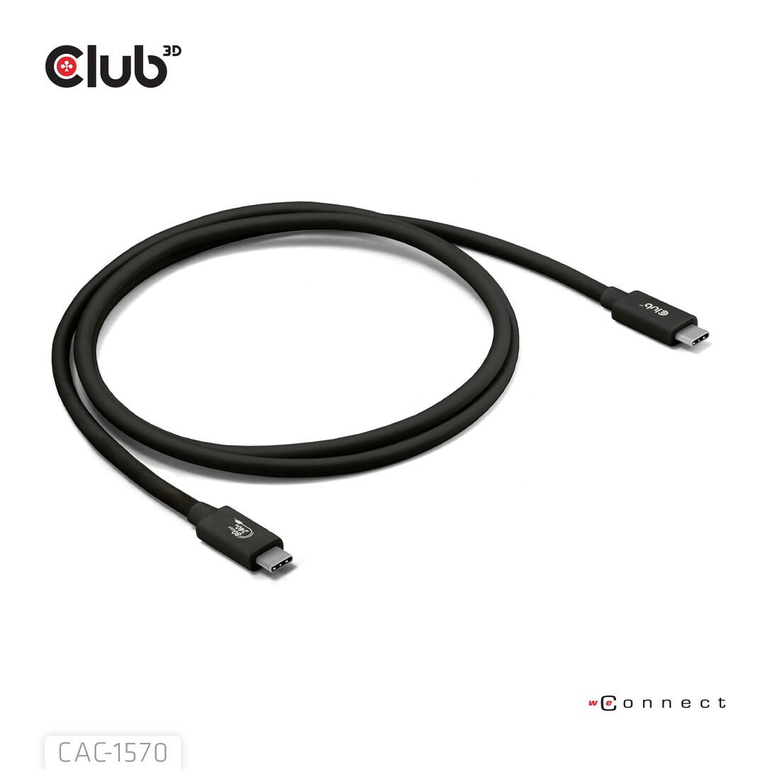CLUB3D CAC-1570. Kabellänge: 1,2 m. Anschluss 1: USB C, Anschluss 2: USB C, USB-Version: USB4 Gen 2x2, Max. Datenübertragungsrate: 80 Gbit/s, Beschichtung Steckerkontakte: Nickel, Produktfarbe: Schwarz, Magnetisch abgeschirmt