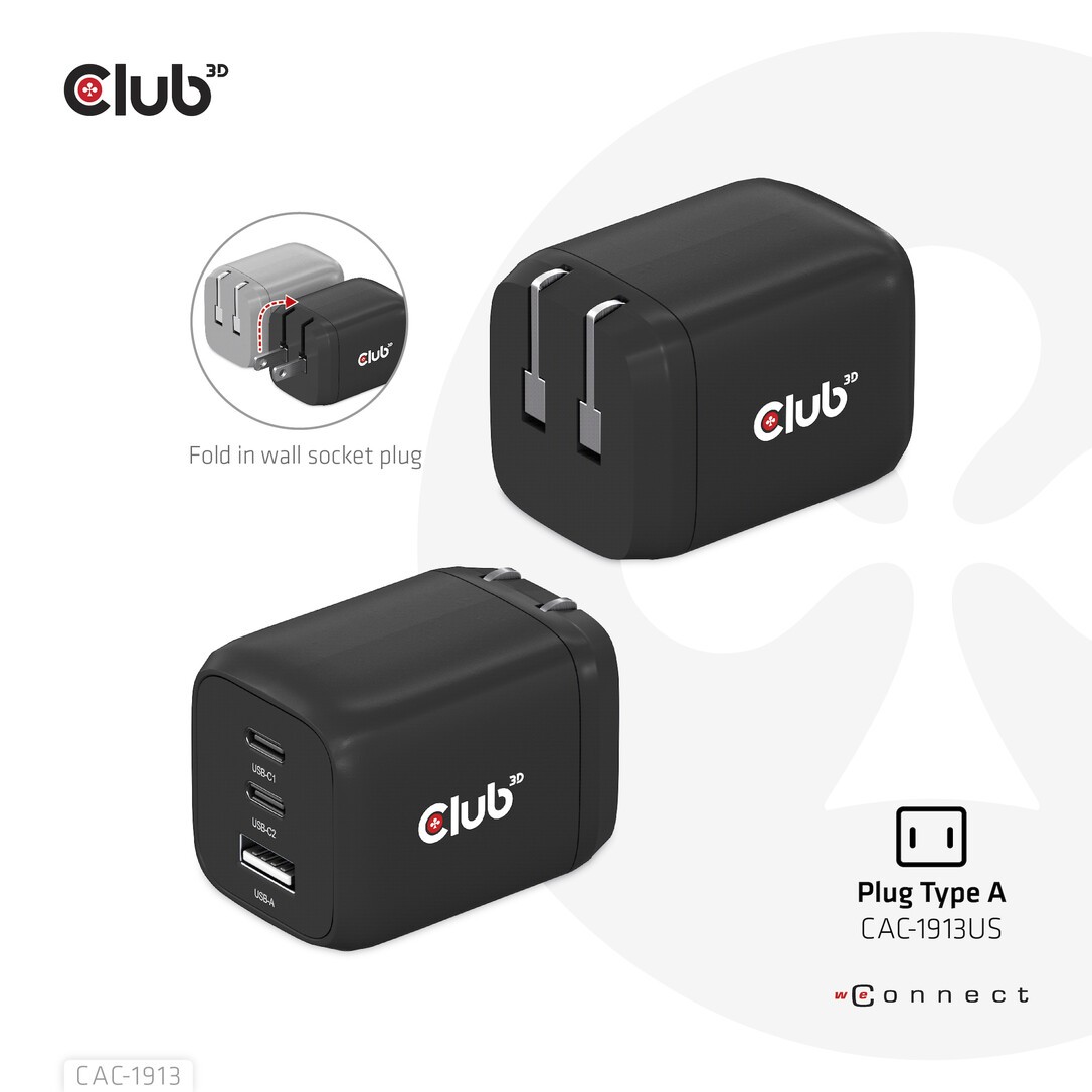 CLUB3D Reiseladegerät PPS 65Watt GAN-Technologie, Dreifachanschluss (2x USB Typ-C + USB Typ-A) Power Delivery (PD) 3.0 Unterstützung, Drinnen, AC, 20 V, 20 A, 1 m, Schwarz