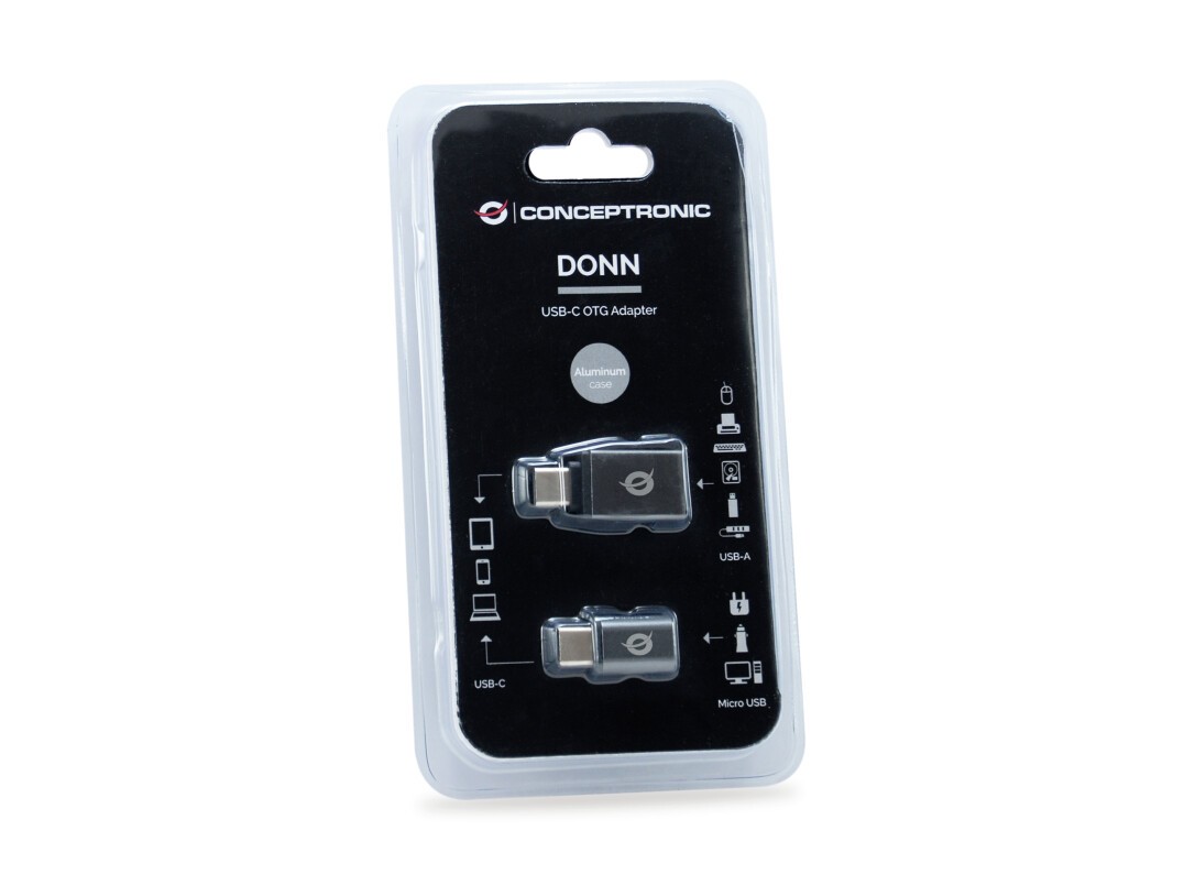 Conceptronic DONN04G OTG-Adapter für USB-C zu USB A/MicroB 2er Pack, 10Gbps (C-A), 480Mbps (C-MicroUSB). Anschluss 1: USB 3.1 Gen 1 Type-C, USB 2.0 Type-C, Anschluss 2: USB 3.1 Gen 1 Type-A, USB 2.0 Micro. Produktfarbe: Schwarz