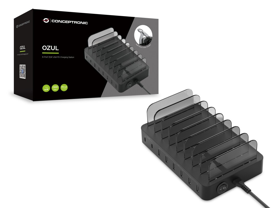 Conceptronic OZUL 8-Port 75W USB-PD Ladestation, Drinnen, AC, 12 V, Schwarz