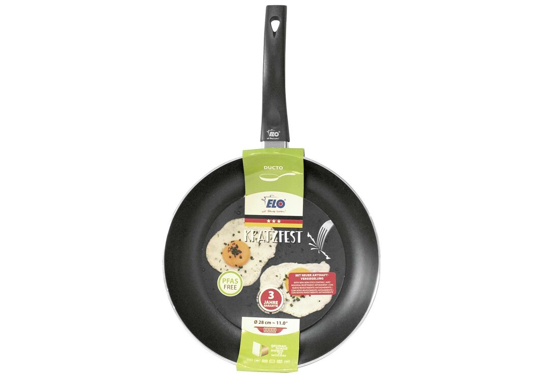Leichtmetallartikel aus Aluminium. Wandstärke: ca. 2,8 mm. Bodenstärke: ca. 3,0 mm. Innen schwarz matte hochwertige, kratzfeste ELODUR® Select Antihaftversiegelung, außen schwarz glänzend Silikon Polyester beschichtet. Gelochter Induktionsboden 18/0. Stiel aus schwarzem Kunststoff und Aluminium Flammenschutz, verschraubt. Ränder abgedreht und poliert. Spülmaschinengeeignet. Für alle Herdarten geeignet, auch für Induktion. Verpackung: Farb-Banderole