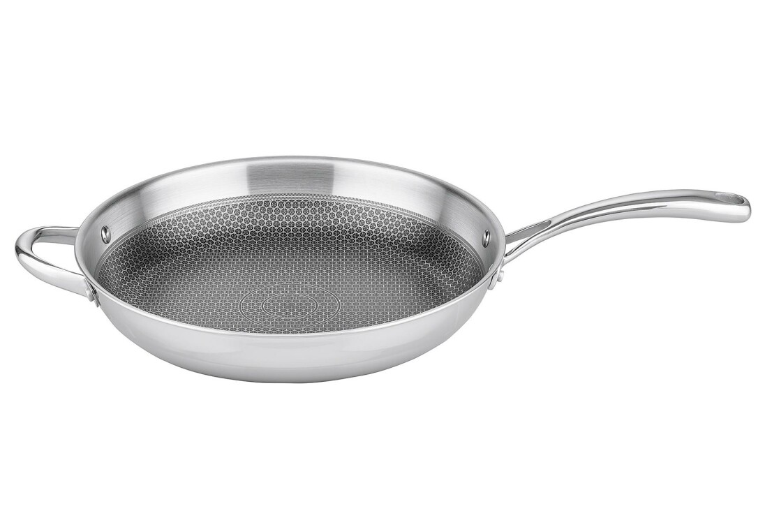 Bratpfanne "Relief Evolution" aus Edelstahl Mehrschicht: innen Edelstahl 18/8 -18/10, durchgehender Aluminium-Kern, außen magnetischer Edelstahl, Gesamtmaterialstärke ca. 2,5 mm, außen hochglanzpoliert, innen satiniert mit Wabenboden: Ätzung ELODUR® Professional, die erhabene Edelstahlstruktur schützt die Antihaftversiegelung perfekt und ist kratzfest, ohne PFAS, für alle Herdarten geeignet, mit Öl-Dosiersystem (Oil Optimizer) garantiert einen reduzierten Einsatz von Ölen, gleichmäßige Wärmeverteilung vom Boden bis zum Rand, backofenfest bis 240 °C (mit Glasdeckel 180 °C). 3,5 l, Ø 32 cm, H 6 cm.
