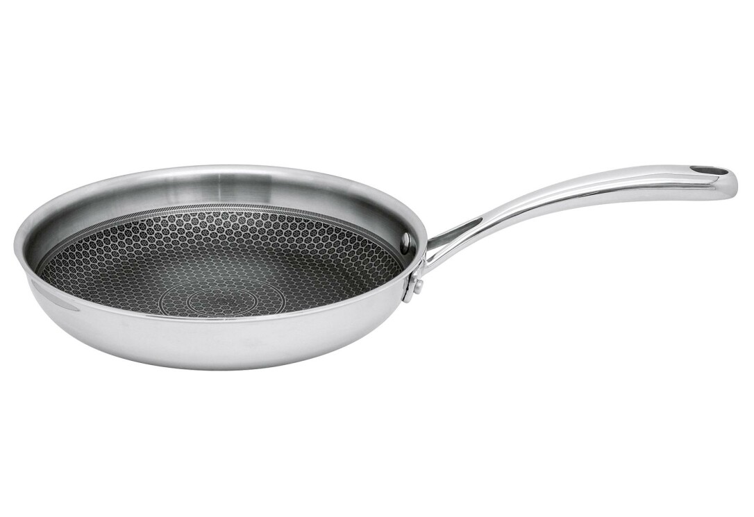 Bratpfanne "Relief Evolution" aus Edelstahl Mehrschicht: innen Edelstahl 18/8 -18/10, durchgehender Aluminium-Kern, außen magnetischer Edelstahl, Gesamtmaterialstärke ca. 2,5 mm, außen hochglanzpoliert, innen satiniert mit Wabenboden: Ätzung ELODUR® Professional, die erhabene Edelstahlstruktur schützt die Antihaftversiegelung perfekt und ist kratzfest, ohne PFAS, für alle Herdarten geeignet, mit Öl-Dosiersystem (Oil Optimizer) garantiert einen reduzierten Einsatz von Ölen, gleichmäßige Wärmeverteilung vom Boden bis zum Rand, backofenfest bis 240 °C (mit Glasdeckel 180 °C). 2,3 l, Ø 28 cm, H 5,5 cm.