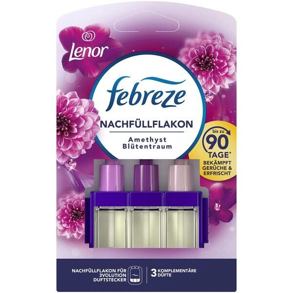 Der Febreze 3Volution Lenor Amethyst Duftstecker bekämpft Gerüche dauerhaft und wechselt zwischen 3 sich ergänzenden Düften für eine spürbare Frische. Hält bis zu 90 Tage (bei 12 Stunden pro Tag auf niedriger Intensitätsstufe). . Lassen Sie sich von einem Gefühl der Ruhe umhüllen, wenn dieser saubere, sanfte Duft die Luft um Sie erfüllt. Bei gewöhnlichen Duftsteckern gewöhnen wir uns schnell an den Duft und nehmen ihn schon bald nicht mehr wahr. Der Febreze 3Volution Duftstecker ist anders, denn er wechselt alle 45 Minuten automatisch zwischen 3 sich ergänzenden, hochwertigen Düften und schafft ein kontinuierliches Frischeerlebnis. Verwenden Sie die Febreze 3Volution Nachfüllflakons mit dem Febreze 3Volution Duftstecker, um Ihrem Zuhause einen frischen Duft zu verleihen, den Sie Tag für Tag und Woche für Woche wahrnehmen. Mit 3Volution können Sie die Intensität des Duftes einstellen, um die von Ihnen gewünschte Umgebung zu schaffen, und zwar wann immer Sie wollen.