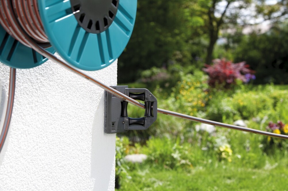 Mit der Schlauchführung lässt sich der Schlauch bequem auf- und abrollen. Sie lenkt den Schlauch in die gewünschte Richtung beim Abrollen und unterstützt beim Aufrollen, so dass er ordentlich und gleichmäßig auf die Trommel gerollt wird. Die Schlauchführung lässt sich individuell an Wand oder Hausecke befestigen.