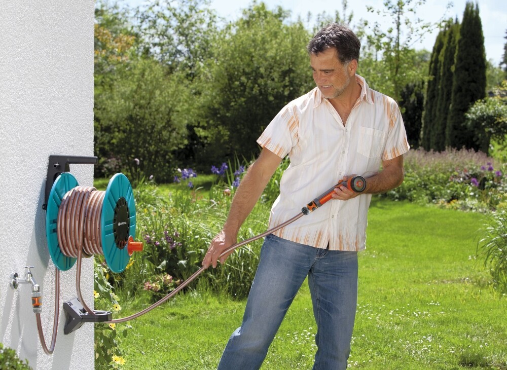 Durch die Wandmontage der Schlauchtrommel lässt sich der Schlauch in aufrechter Körperhaltung und damit rückenschonend aufwickeln.