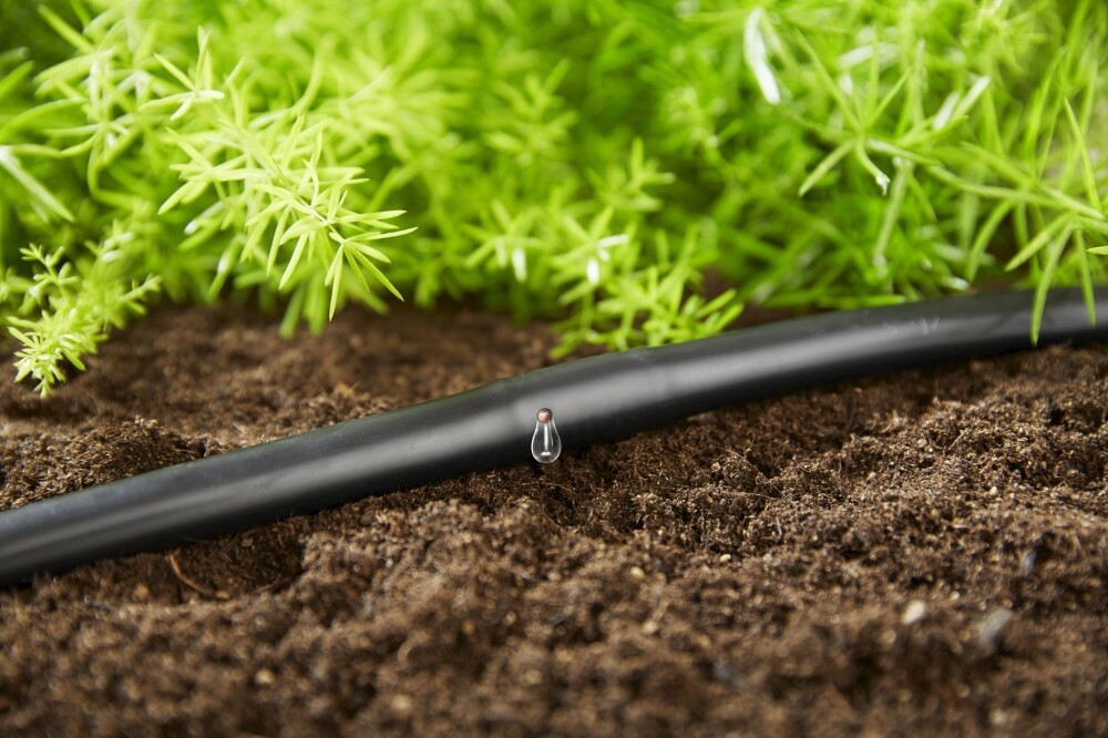 Mit der Micro-Drip-System Tropfbewässerung gelangt das Wasser genau dosiert und ohne Verdunstung an die Pflanzen, sodass kein Wasser verschwendet wird.