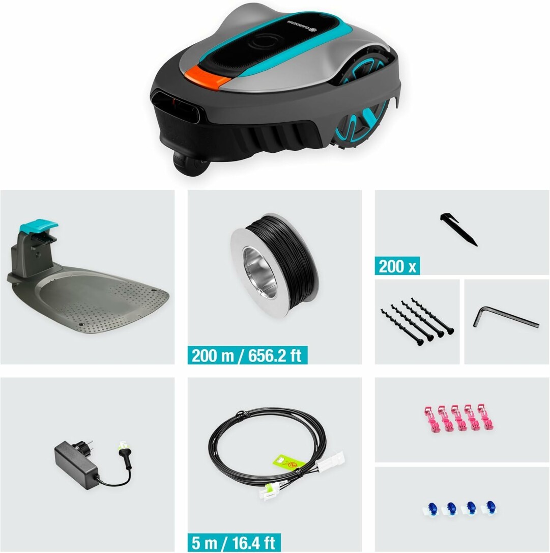 Lieferumfang: 1x Gardena Mähroboter SILENO city 600 m², Ladestation, 200m Begrenzungskabel, 200 x Haken, 4 x Verbinder, 5 x Anschlussklemmen, DE-Version