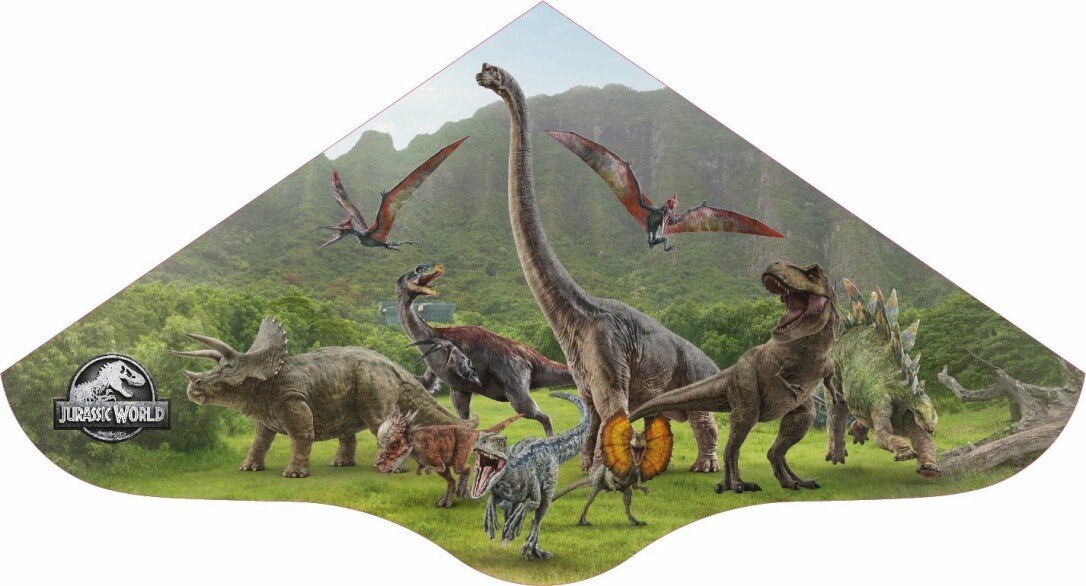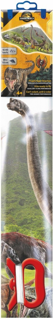 Kinderdrachen Jurassic World Escape. Segel aus PE-Folie. Größe: 98 x 53 cm. Komplett mit Wickelgriff und Schnur. Wind: 20-40 km/h. Geeignet ab 4 Jahren.