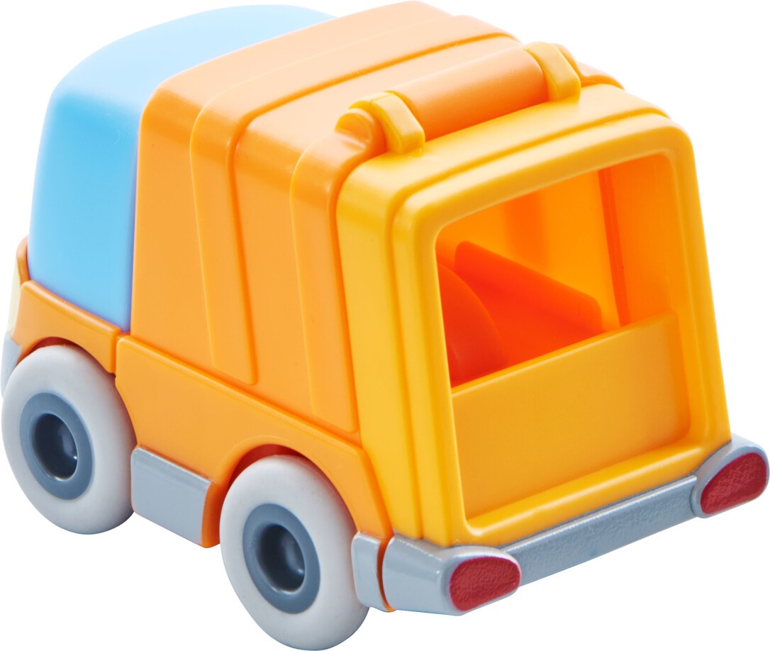 Einmal in der Woche fährt das große Müllauto durch Kullerbü, öffnet seine Heckklappe und sammelt den Müll ein. Das geht immer ruck, zuck, denn dank des Schwungmotors fährt das Müllauto schnell von Haus zu Haus. Material: Kunststoff. Maße: Müllauto L 9 x B 5,7 cm.