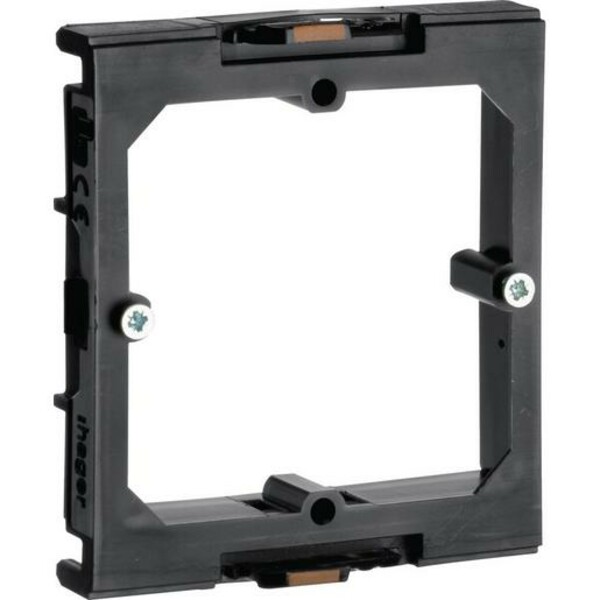 Gerätemontagering frontrastend für Datentechnik mit Standardgeräteeinbau schwarz. Gerätemontagering zur frontrastenden Befestigung für Standard-Geräteeinbau mit Rahmen des Schalterherstellers. Mit zwei Gerätehalteschrauben in Schnellgewindeausführung. Vertikaler und horizontaler Geräteeinbau, Fixieren und leichtes Umpositionieren der Geräteeinbaudose durch mechanische Verriegelung möglich.