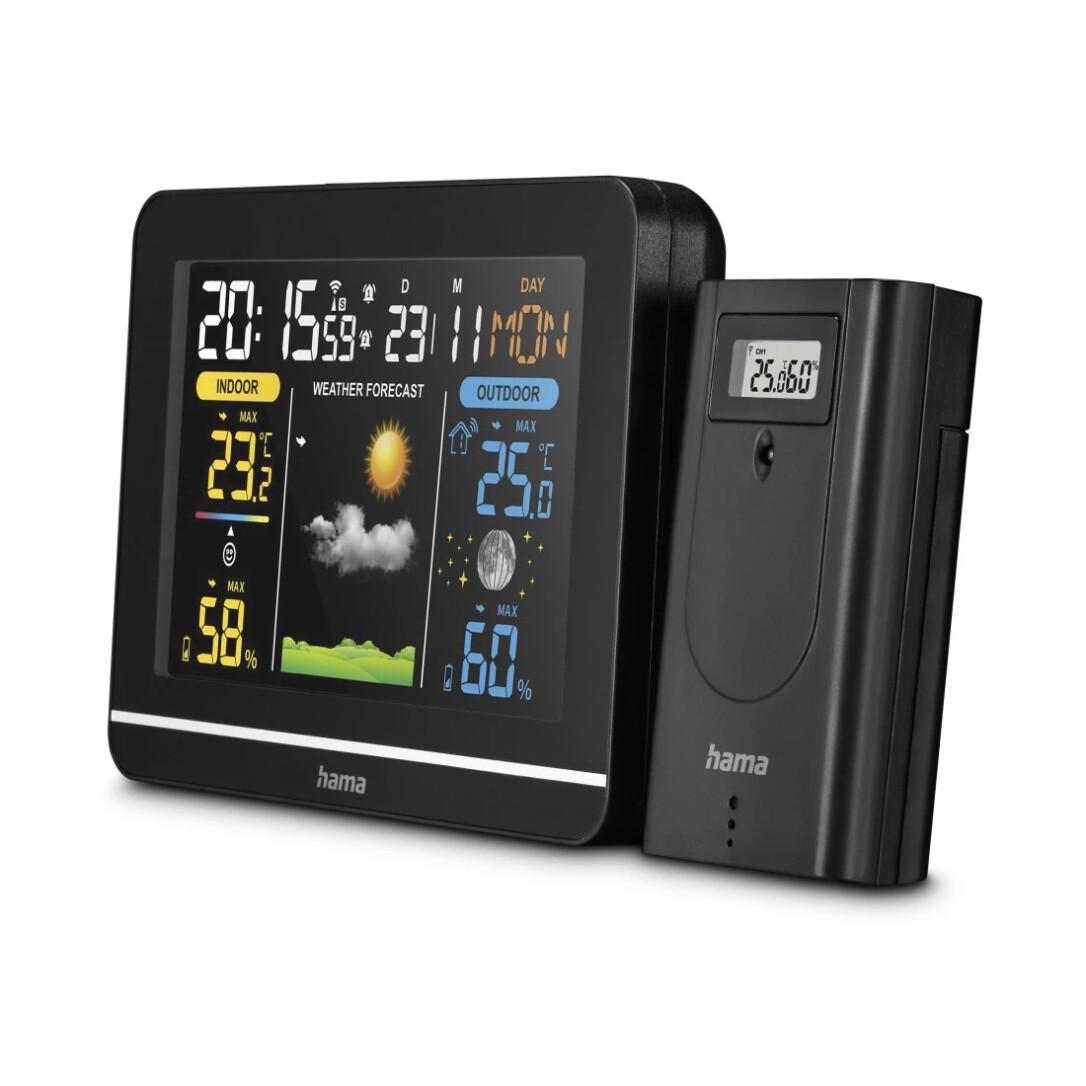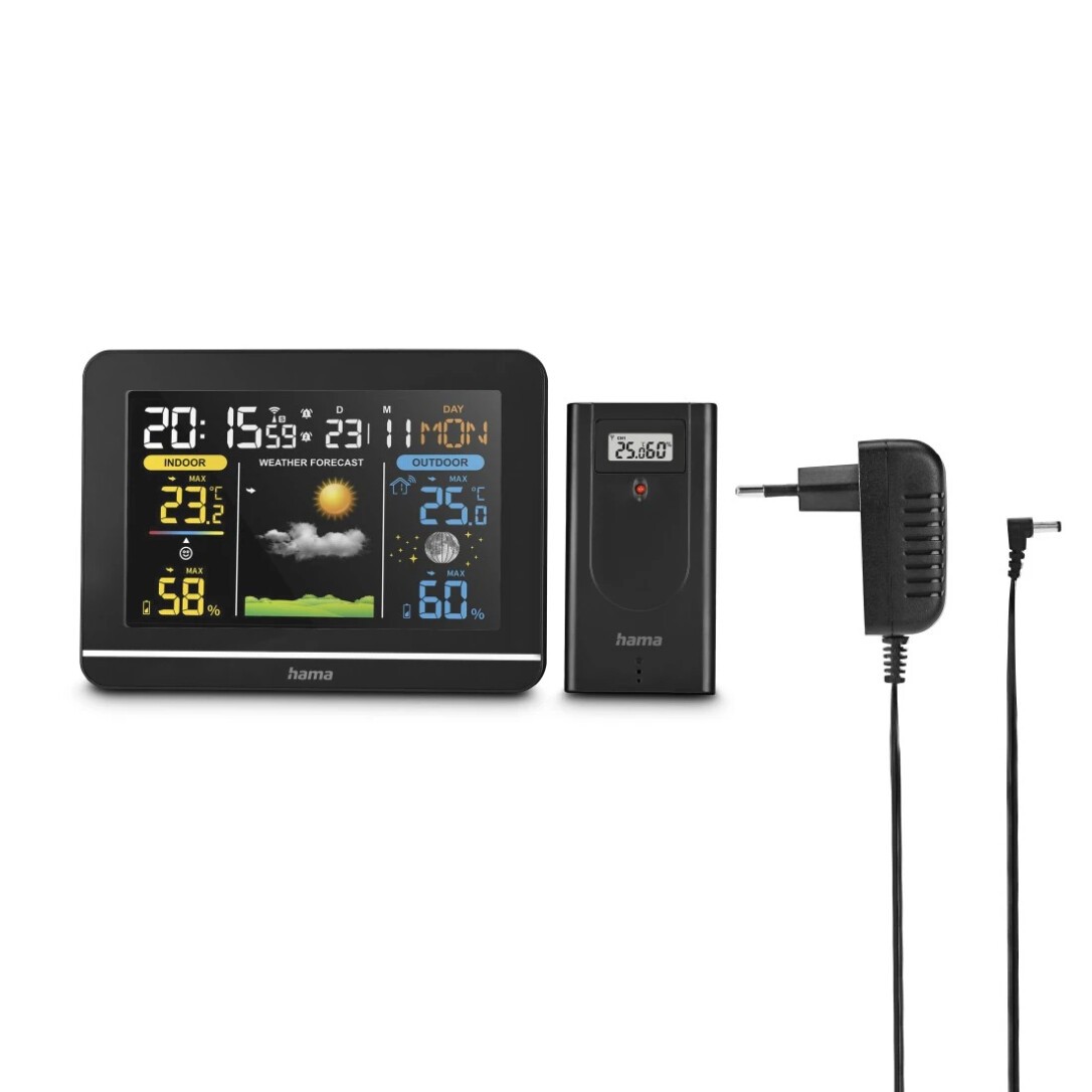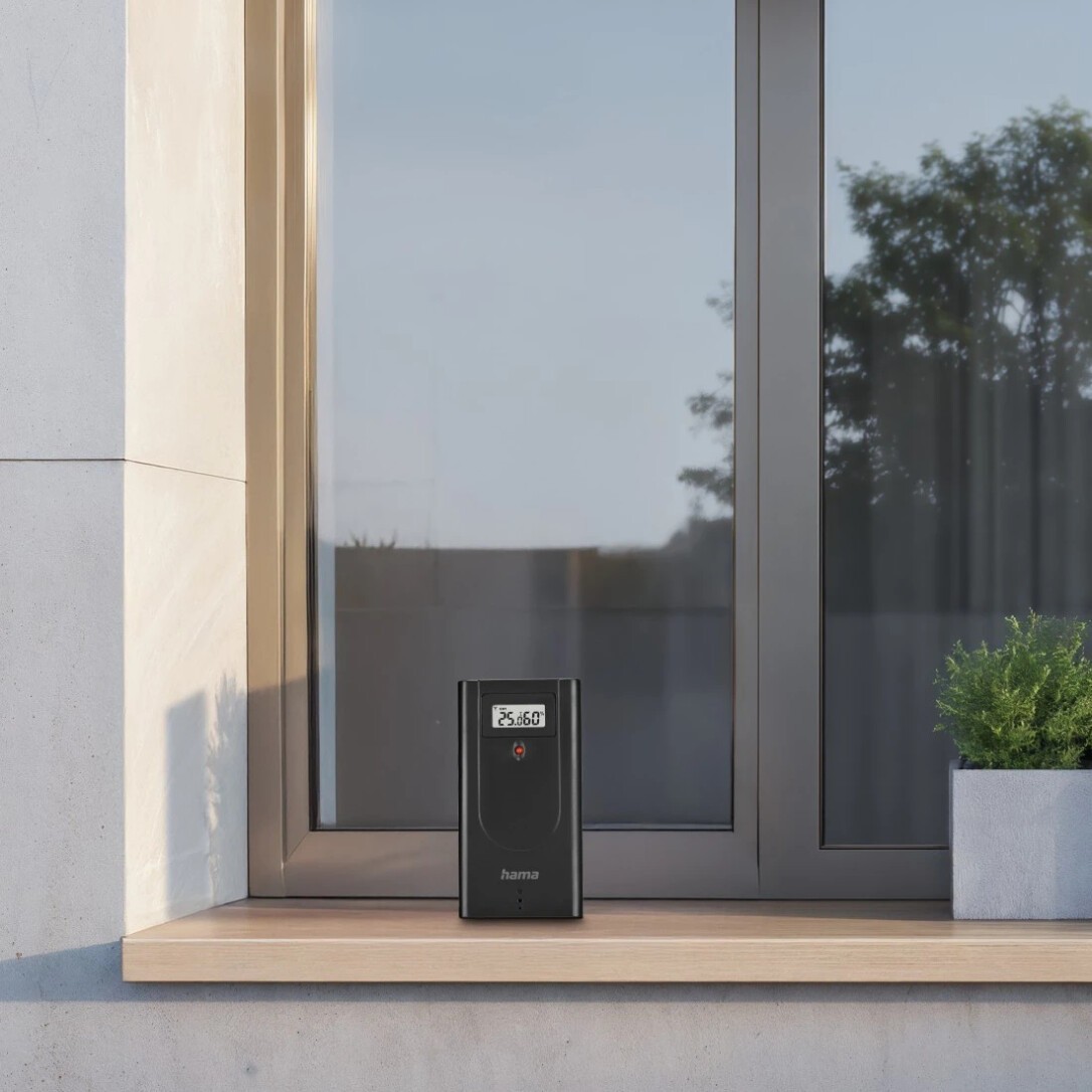 Hama Usedom. Produktfarbe: Schwarz, Messfunktionen: Innen-Hygrometer, Innen-Thermometer, Außen-Hygrometer, Außen-Thermometer, Messfunktionen Trenddisplay: Hygrometer, Thermometer. Energiequelle: AC, Akku-/Batterietyp: AA. Breite: 156 mm, Tiefe: 31 mm, Höhe: 114 mm. Menge pro Packung: 1 Stück(e), Anzahl enthaltener Akkus/Batterien: 2 Stück(e). Übertragungstechnik: Kabellos