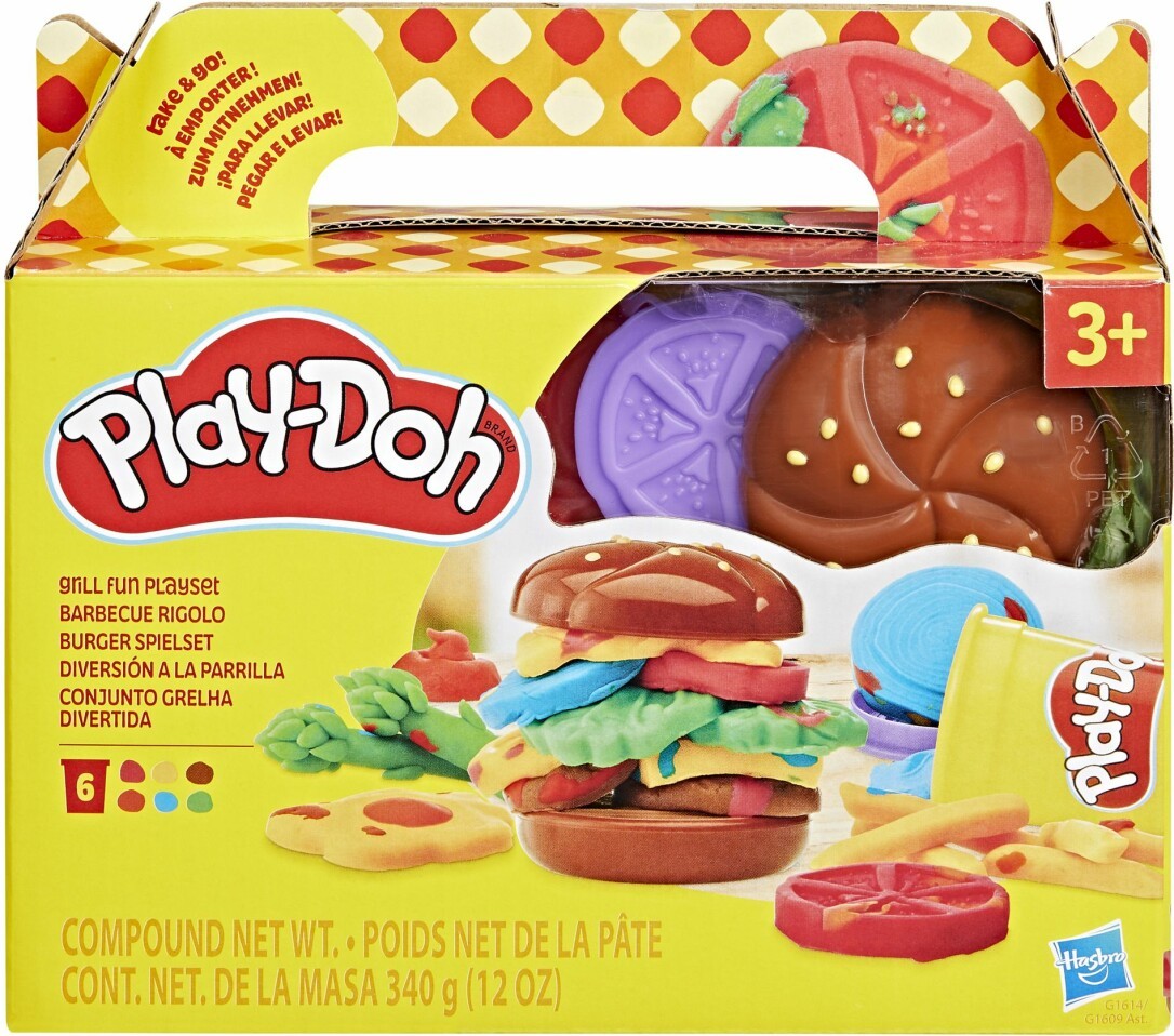 Mit dem Burger Spielset können Kinder ihren eigenen Play-Doh Burger gestalten! Dieses kleine Play-Doh Set mit 6 Knetwerkzeugen und 6 Farben Spielknete eignet sich perfekt als kreative Pause zum Mitnehmen. Die Kinder können lustige Zutaten wie Spiel-Patties, Käse und Gemüse formen und sie dann auf die 2 Spielzeug-Burgerbrötchen legen, um die Kreation zu vollenden. Dieses komplette Play-Doh Set eignet sich für alle möglichen Anlässe, z. B. als Geschenk zum Nikolaus, für den Osterkorb oder als kleines Geschenk für Kinder ab 3 Jahren. PLAY-DOH und HASBRO und alle damit verbundenen Marken und Logos sind Marken von Hasbro, Inc.