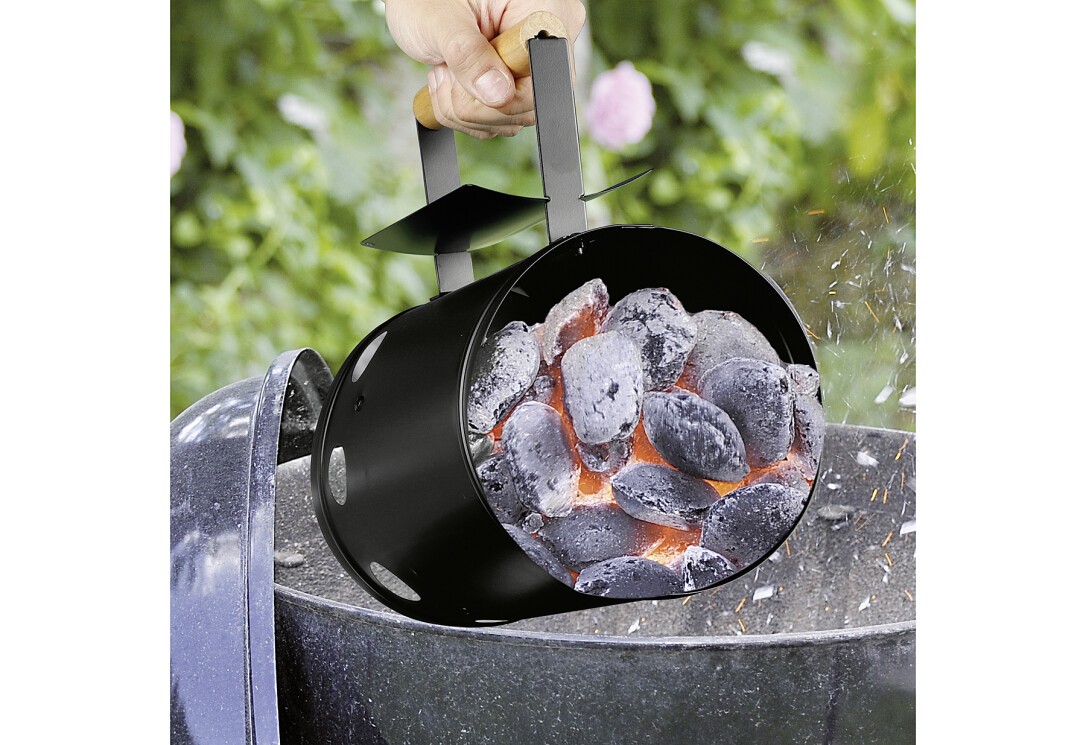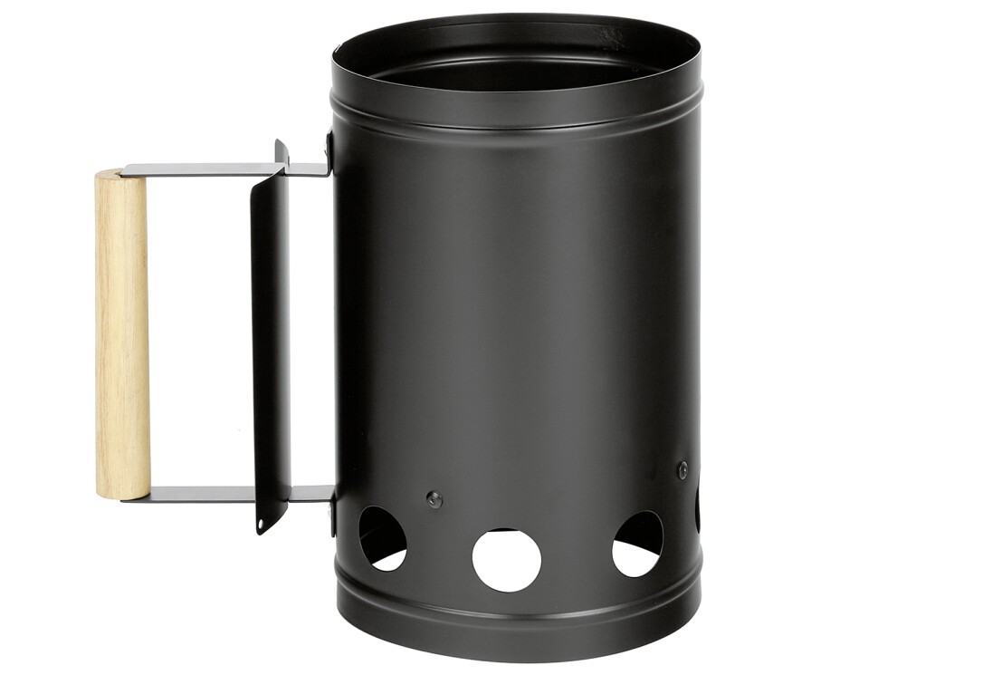 Anzündkamin / Kohlestarter, Metall, mit Holzgriff, Maße: Ø 17 cm, H 27 cm, Farbe: schwarz.