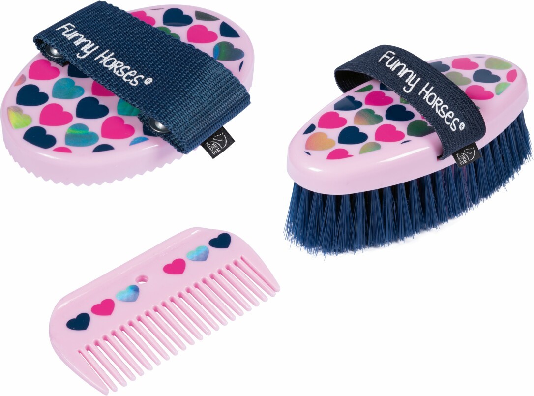 Putzset -Funny Horses Hearts-besteht aus Striegel, Kardätsche und Mähnenkamm. Ab 3 Jahren.