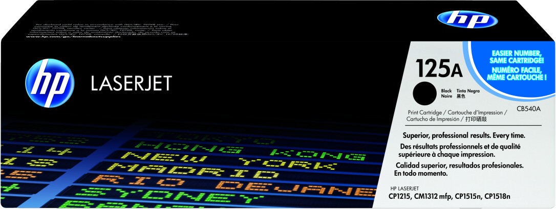 Die Color LaserJet CB540A Druckkassette schwarz überzeugt durch Fotolaborqualität im eigenen Büro. Brillante, auffallende Farben, gestochen scharfe Texte und realistische Fotoqualität; so erzielt Ihre Firma die gewünschte Aufmerksamkeit.