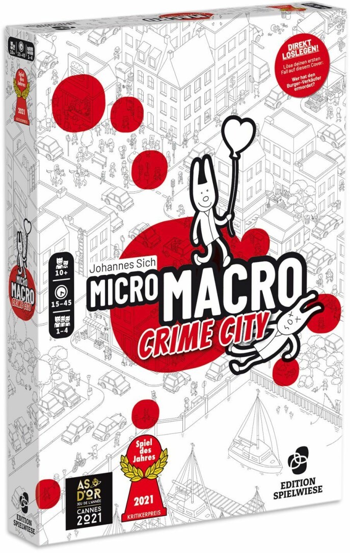 Willkommen in Crime City, einer Stadt, in der hinter jeder Ecke das Verbrechen lauert. Verhängnisvolle Geheimnisse, hinterhältige Überfälle und kaltblütige Morde sind hier an der Tagesordnung. Die örtliche Polizei ist nicht mehr in der Lage, die Geschehnisse zu kontrollieren. Daher ist die Arbeit pfiffiger Ermittelnder gefragt. MicroMacro: Crime City ist ein kooperatives Detektivspiel. Gemeinsam lösen die Spielenden 16 knifflige Kriminalfälle, indem sie Motive ermitteln, Beweise finden und die Verbrecher*innen überführen. Ein aufmerksames Auge ist ebenso gefragt wie kreative Kombinationsgabe, um auf dem 75 x 110 cm großen Spielplan alles zu enträtseln. Als kleine Hilfe ist dazu im Spiel eine Lupe enthalten. Eine Person übernimmt die Rolle des Kommissars bzw. der Kommissarin und ist dafür verantwortlich, die Fallkarten vorzulesen (rätselt aber natürlich auch mit). Die Spielenden wählen gemeinsam aus, welchen Fall sie spielen und der bzw. die Kommissar*in liest die entsprechende Startkarte sowie die erste Aufgabe vor. Gemeinsam erkundet die Gruppe den Stadtplan von Crime City, um nach und nach alle Fragen auf den Fallkarten zu beantworten. Das Spiel endet, sobald die letzte Fallkarte richtig beantwortet wurde.