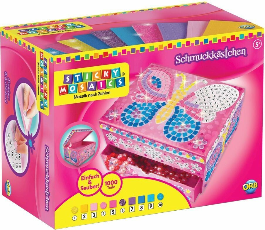 Mit Sticky Mosaics entstehen tolle Wohnaccessoires in Mosaiktechnik. Gestalte dein eigenes funkelndes Schmuckkästchen für deine Schätze. Inhalt: Schmuckkästchen, ca. 1000 funkelnde Fliesenplättchen und Juwelen (selbstklebend). Ab 5 Jahren.