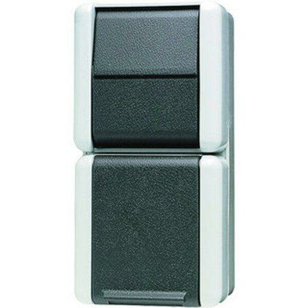 SCHUKO-Steckdose - 16 A 250 V ~ - mit Wippschalter - 10 AX 250 V ~ - Universal Aus-Wechsel - Steckdose mit Klappdeckel - Schalter beleuchtbar im Sinne der Arbeitsstättenverordnung durch Lampe Art.-Nrn.: 90 bzw. 95 (230 V), 96-.. (Kleinspannung) bzw. LED-Leuchte Art.-Nr.: 90-LED.. (230 V) bzw. 961248 LED.. (Kleinspannung). - mit Federklemmen für Leiter bis 2,5 mm² - Gehäuseabmessungen (B x H x T): 75 x 151 x 58 mm - 2 Leitungseinführungen