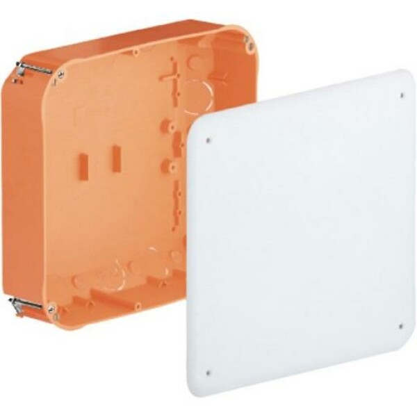 Verbindungskasten 9197-91, für Hohlwand-Installation, zum Einbau von: DIN-Anschlussleisten, Normschienen TS 35 für Reihenklemmen usw., Klemmsteine bis 16 mm², mit beigefügter Bohrschablone, Länge x Breite x Tiefe 235 x 205 x 72 mm, Fräsloch Ø 4 x 68 mm, Ausbrechöffnungen Ø 20 mm - 8, Ausbrechöffnungen Ø 25 mm - 2, Ausbrechöffnungen Ø 32 mm - 2, Leitungseinführungen für NYM- und Kleinspannungsleitungen, für Klemmen bis 16 mm².